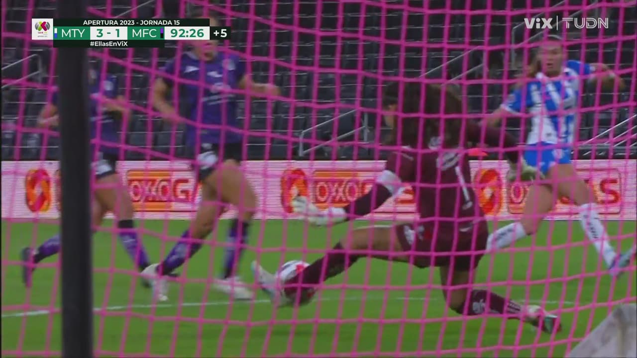 La atacante de Rayadas entró sola y remató cruzado, pero la guardameta de Mazatlán le dijo que no con una buena atajada.