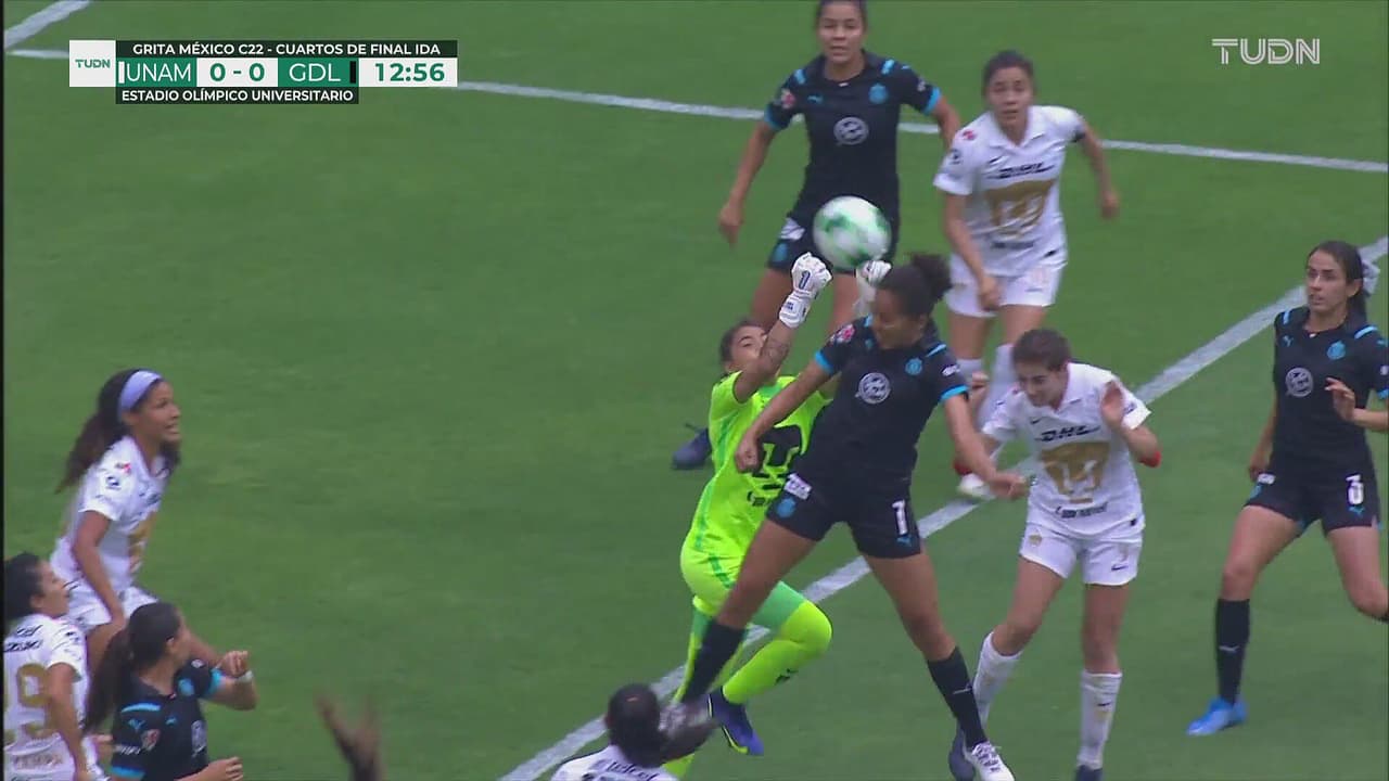 El guardameta de Pumas salió en busca del balón y la jugadora tapatío remató desviado con la testa al 13'.