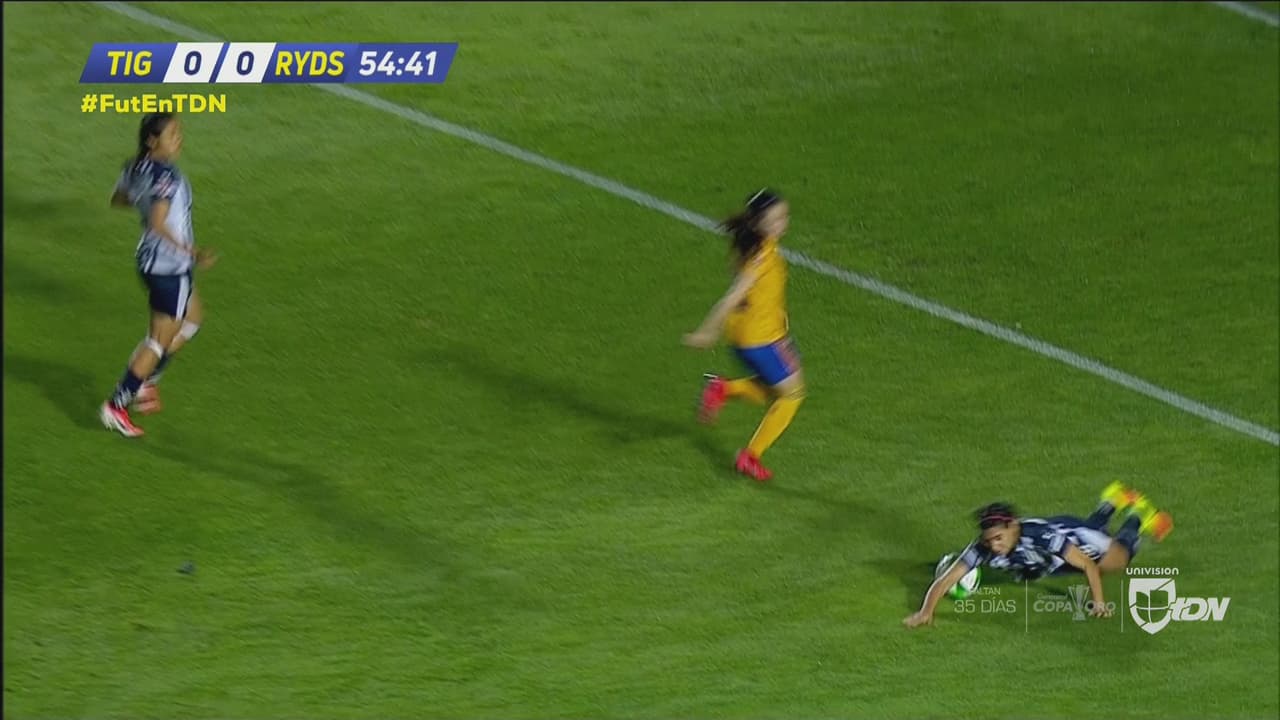 Mariana Cadena cae en el área y con el brazo evita que el esférico genere peligro a favor de Tigres.