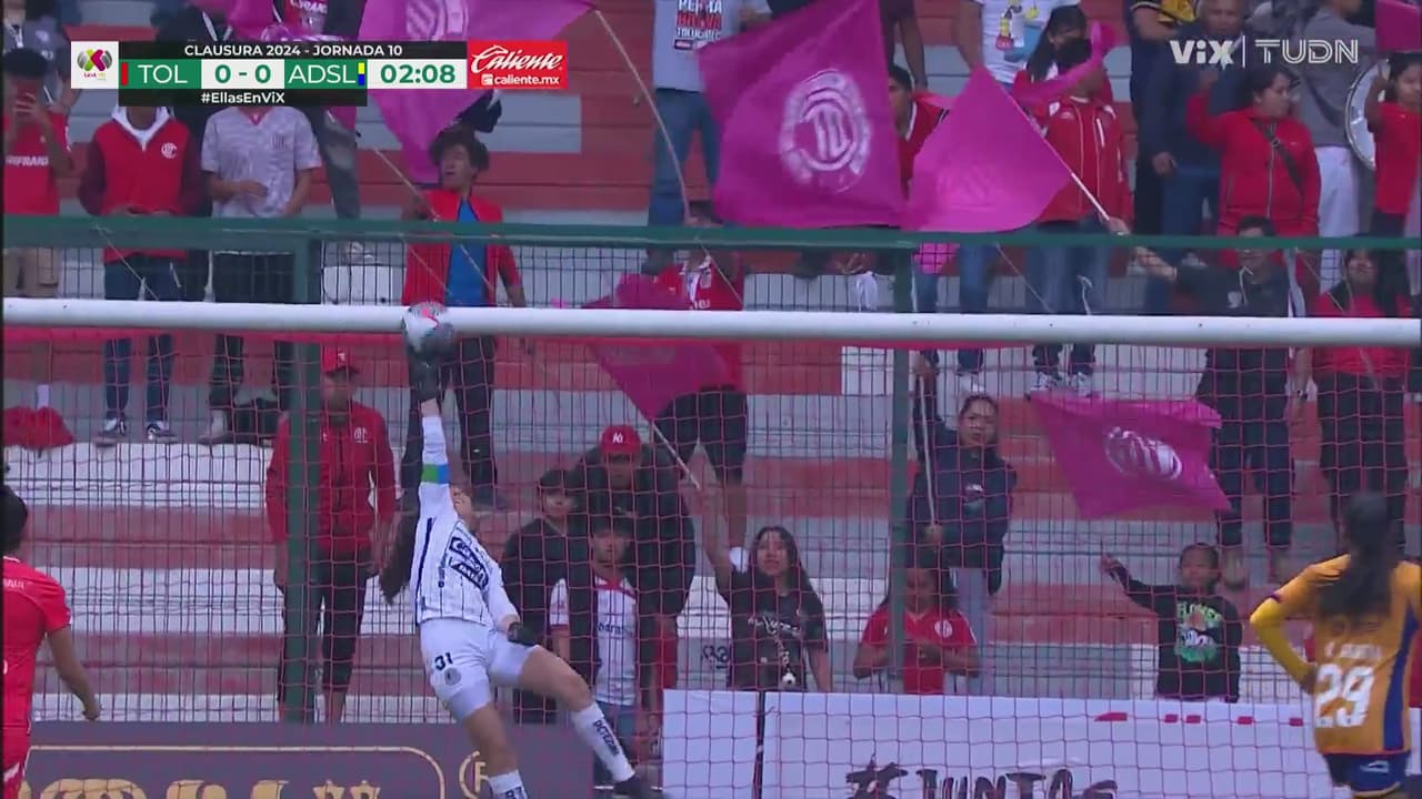 Cinthya Peraza mandó zapatazo que logró rozar la cancerbera potosina estrellándose el balón en el horizontal.