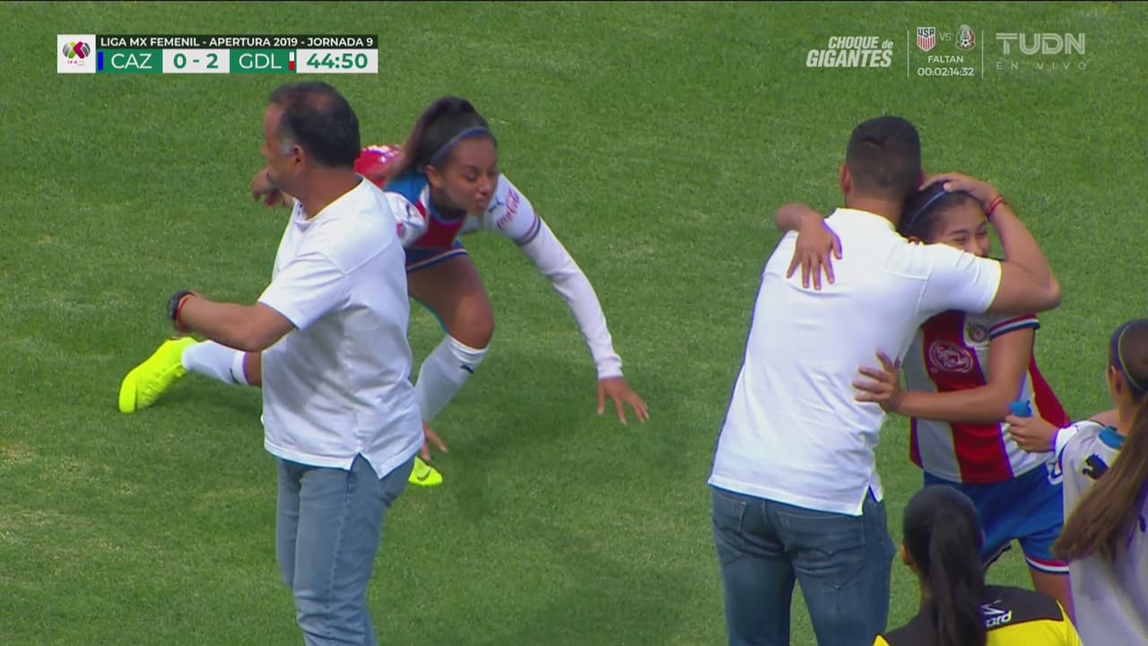 La defensora de Chivas cae tras el segundo gol de su equipo. Al final, todo queda en un susto.