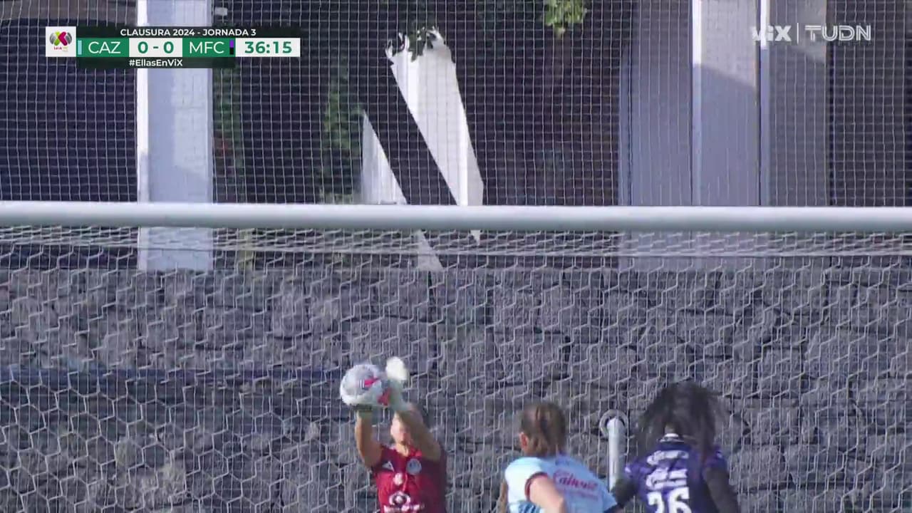 La jugadora Celeste lo intenta de larga distancia con potencia, pero la arquera visitante rechaza de forma correcta.