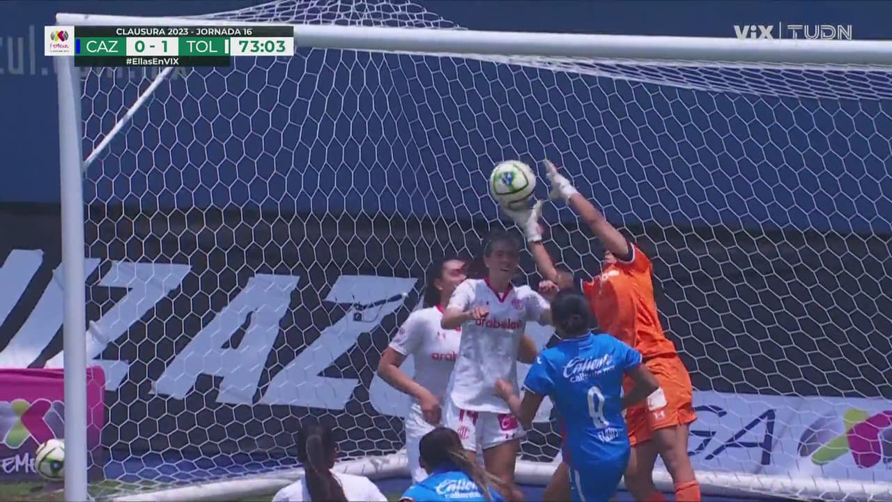 Buena chilena de Ana García que no aprovecha Patricia Jardón dejando en tierra de nadie el balón salvándose Toluca.