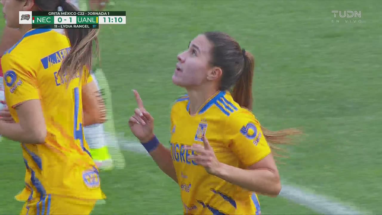 El primer tanto de Tigres llegó al minuto 10 cuando Nayeli Rangel mandó un disparo que debió controlar Lupita Olvera, pero la arquera del Necaxa no supo atacar el esférico y regaló el tanto a su rival.