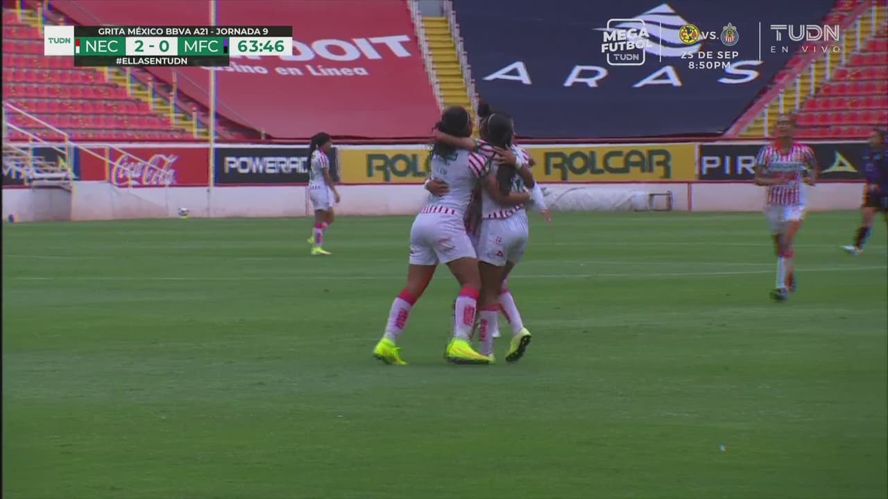 Sobre el minuto 74 vino la segunda anotación para Necaxa, cuando Libeth Paulina pasó entre cuatro jugadoras del Mazatlán FC y disparó certera al arco, con lo que la ventaja iba en aumento.