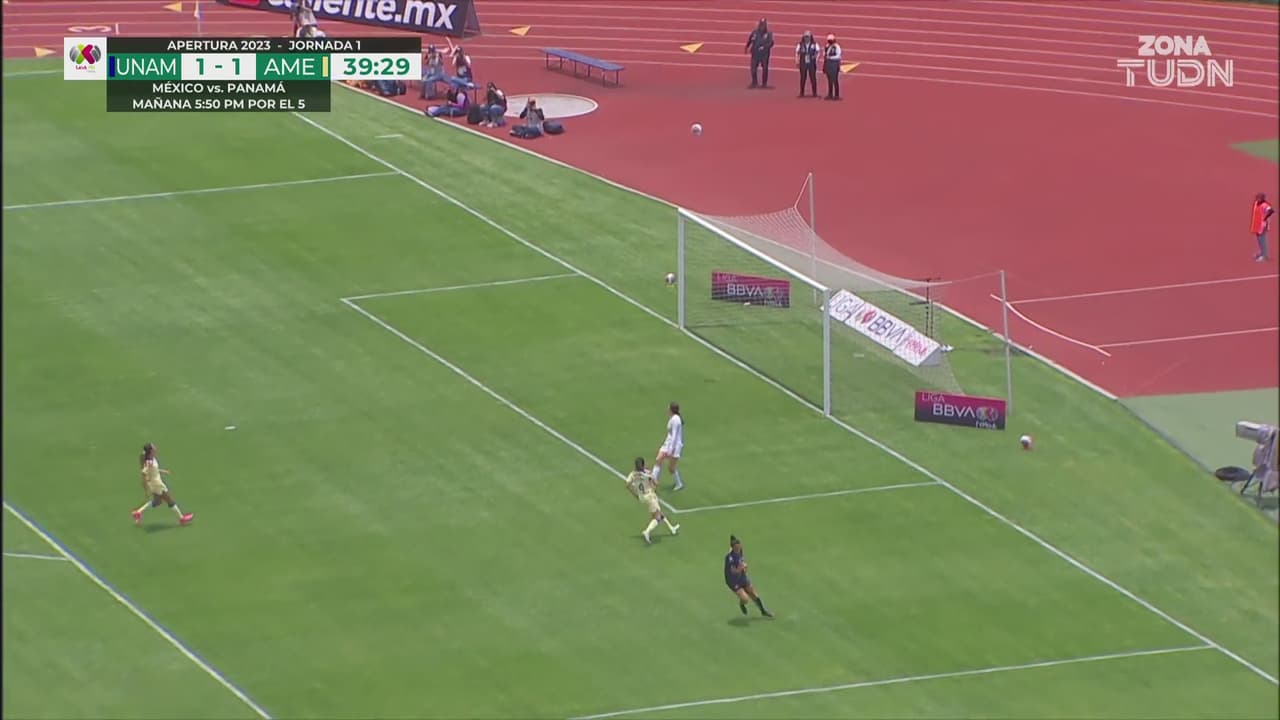 Balón perdido por América, dejando a la jugadora de Pumas que iba sola para tratar de sorprender a Itzel Velasco.