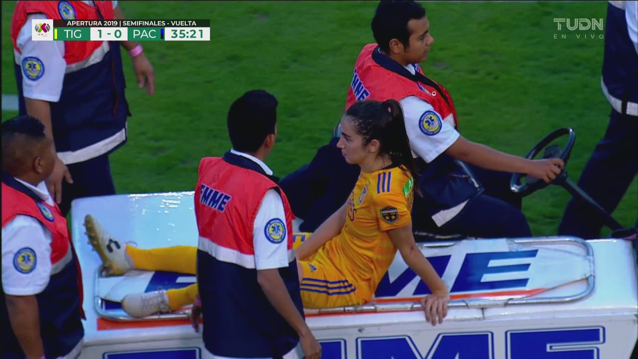 La atacante se tiró en un costado del campo y tuvieron que entrar los servicios médicos para el cambio a los 35 minutos.