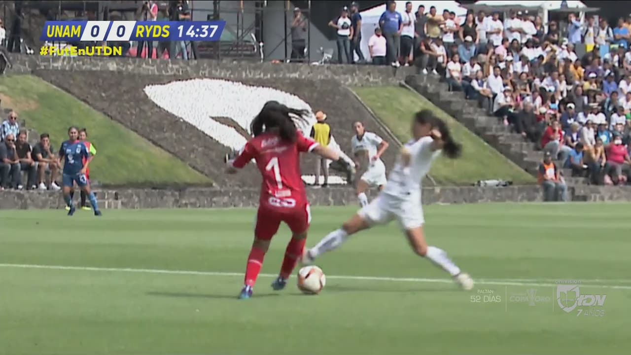 Claudia Lozoya, guardameta de Rayadas, se agrandó y le hizo una mágica jugada a Edna Santamaría al borde su área.