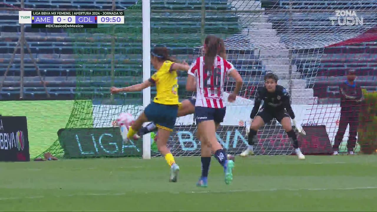 La jugadora del América sacó un zurdazo que alcanzó a desviar la defensa rojiblanca a tiro de esquina en el Estadio Ciudad de los Deportes.