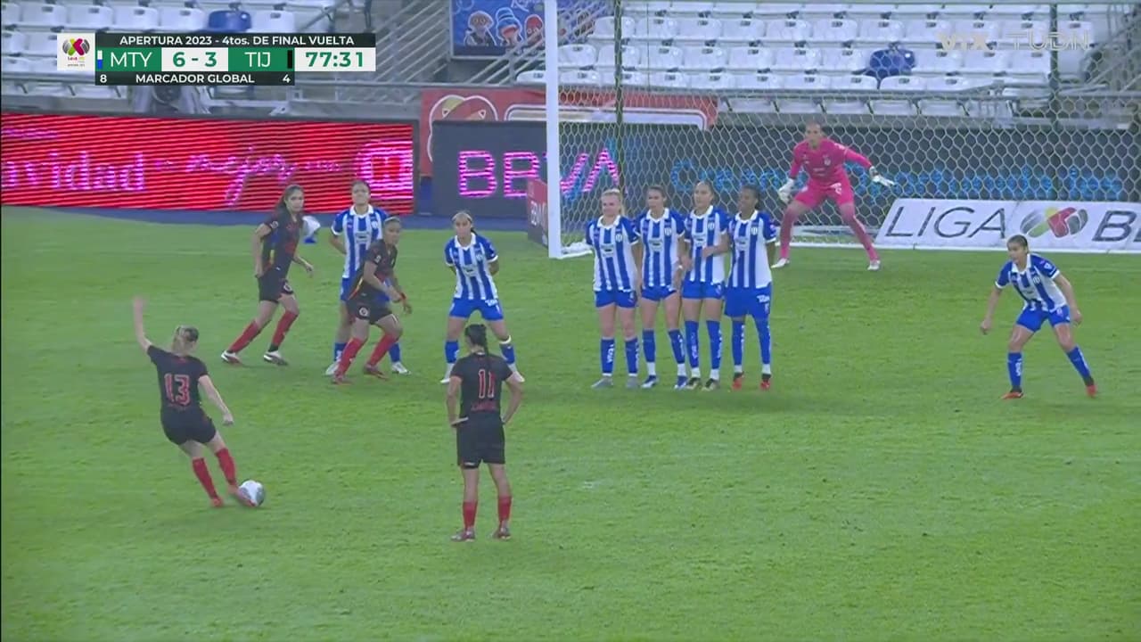 Espectacular cobro de tiro libre por parte de la camisa 13 pegándole con el empeine entre las jugadoras más altas de Rayadas.