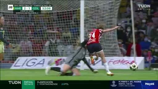 La portera de América sale y Alicia se va al césped en el área, la árbitra no se anima a marcarlo, al 52'.