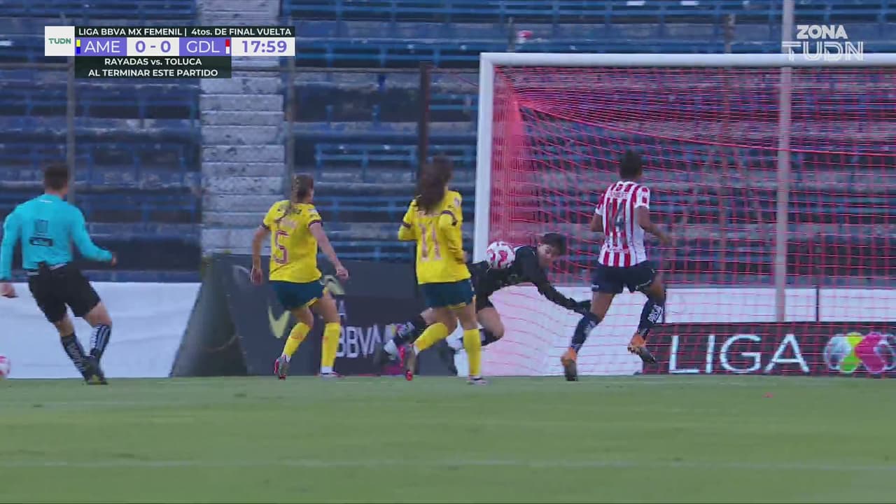Era gol de América en los pies de Irene Guerrero, pero Félix logró detener el tiro que se estrelló en el travesaño.