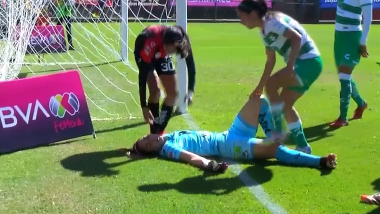 La arquera de Santos, Wendy Toledo de 20 años cayó inconsciente en el campo tras golpe en la cabeza en el duelo ante Atlas en Colomos.