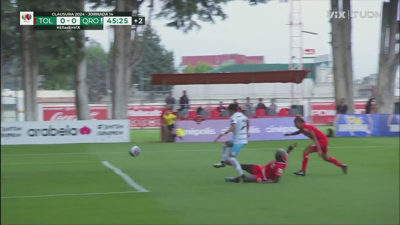 La delantera saca ventaja de su posición y con la pierna derecha toca el balón que termina en el poste de Querétaro.