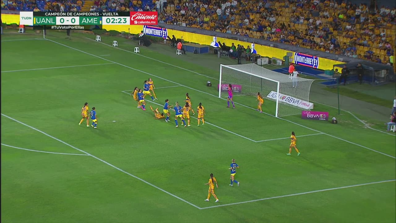 Kiana Palacios remata un tiro de esquina de Alison González que no alcanza a ir con destino de gol.