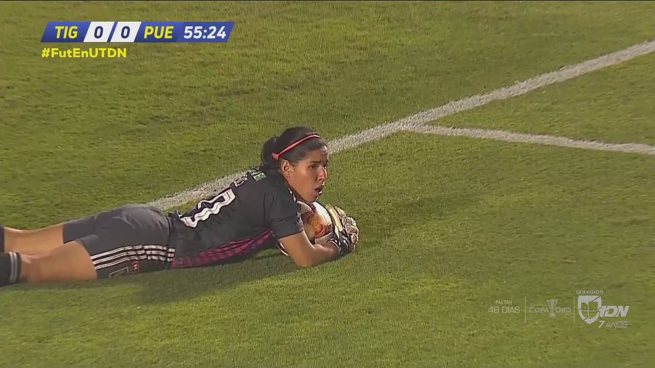 La Franja quiere poner en aprietos a las felinas al abrir el marcador, pero la guardameta de Tigres reacciona para atajar el esférico.