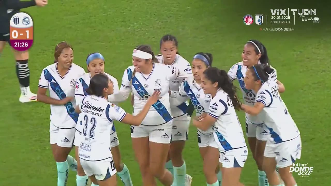 La jugadora poblana se encuentra con el esférico afuera del área grande y mete zapatazo para doblegar a la guardameta de Monterrey,