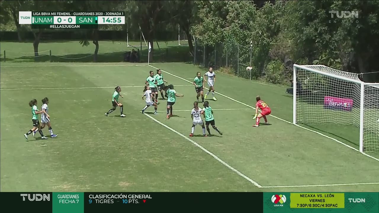 ¡Pumas casi se va al frente! Disparo de Natalia Macías a un lado del arco del Santos