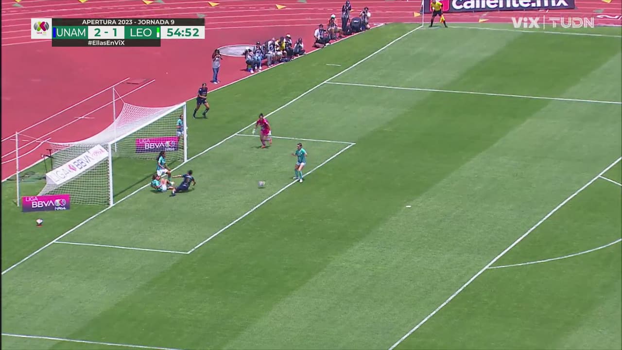 Una escapada de Chavero acabó en diagonal para Mónica, pero una pierna salvadora evitó el remate de la universitaria.