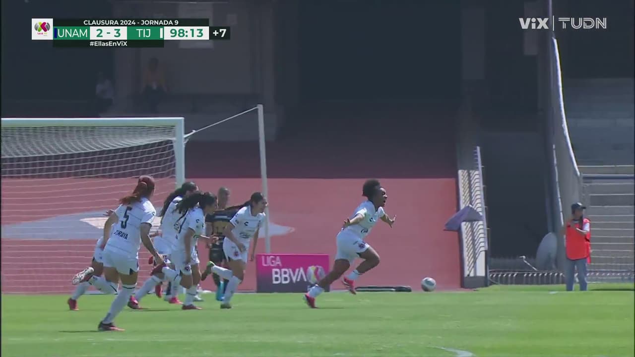 El cuadro de la UNAM volvió a ser víctima del balón parado con otro increíble cobro de Tijuana en los linderos del área, ahora fue Cox que pusó la redonda por debajo del travesaño para el 2-3 en el alargue, al 90+7'.