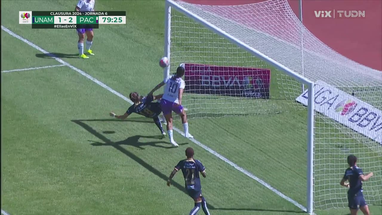 Diagonal de Charlyn que buscaba anotar uno más pero Brenda le meta la pierna al balón que se estrella en la vertical.