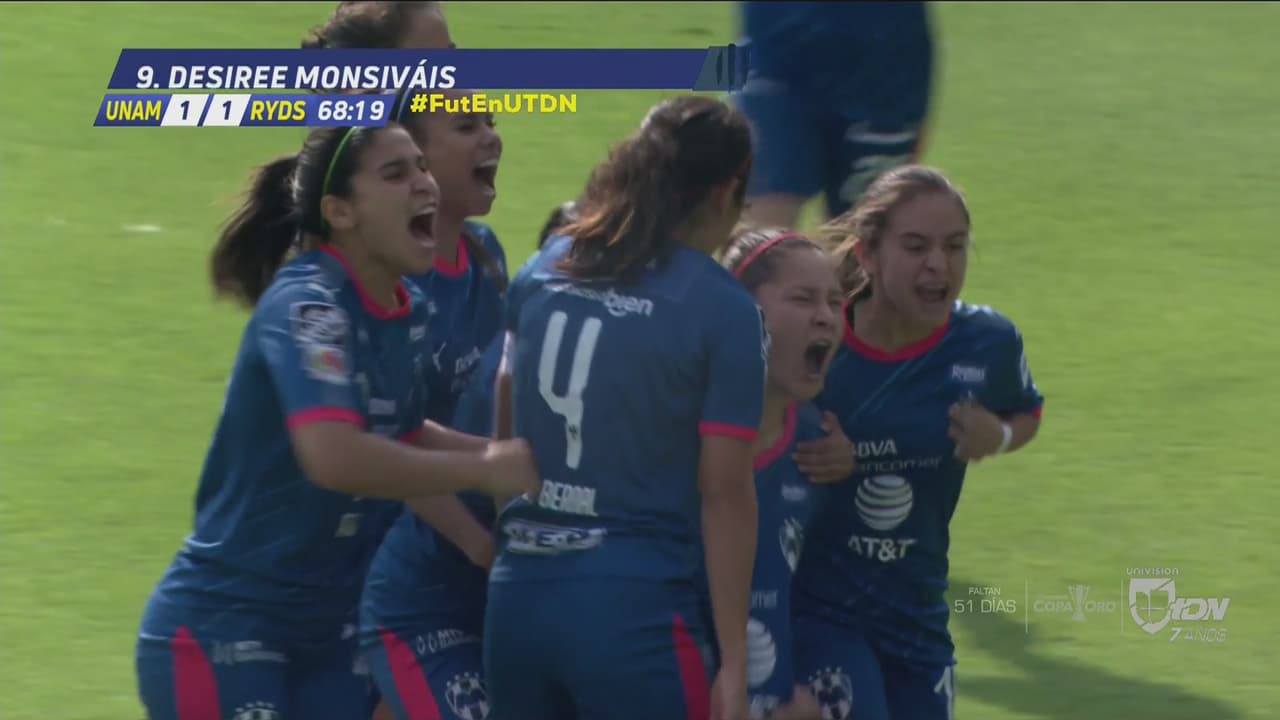 Tiempo después Desiree Monsiváis recibió fuera del área y con una media vuelta y un disparo potente mandó el balón al fondo de las redes para empatar el encuentro para Rayadas, ya se disputaba el 67’.