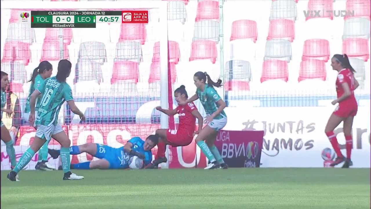 ¡Remate cerrado que suelta la cancerbera de León y nadie la impacta!