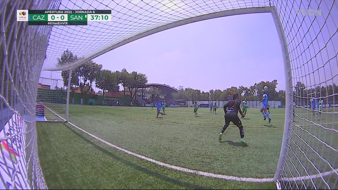 Ana García estrelló su cabezazo en el travesaño después de un gran centro por izquierda que remató la jugadora de Cruz Azul y el esférico pegó en el travesaño al 90+4'.