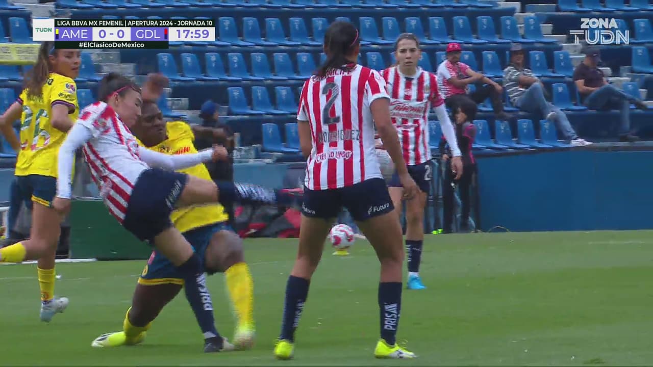 La defensa del América fue amonestada por la falta sobre la delantera de Chivas que minutos atrás le dio un patadón en el rostro.