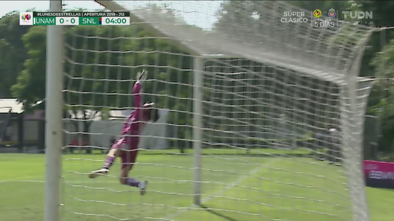 En los primeros momentos del partido la portera de San Luis se lanza para evitar el tanto universitario.
