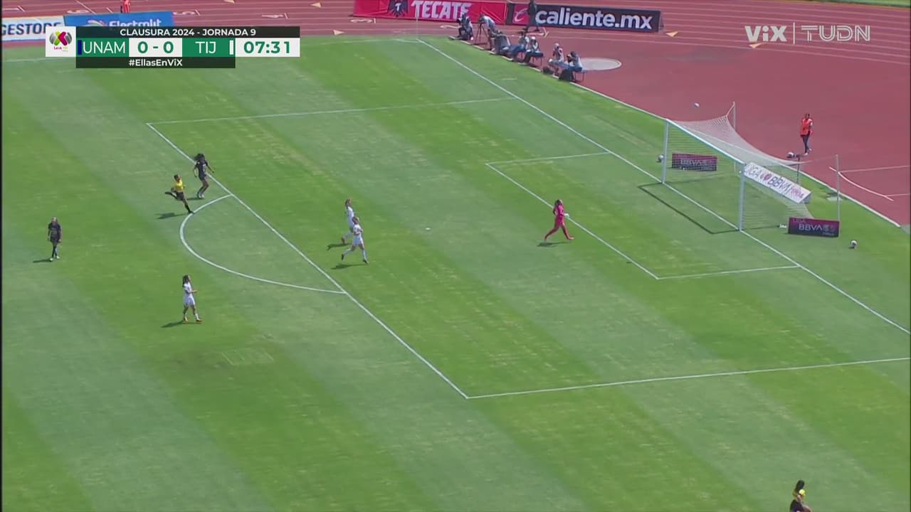 Buen balón que le ponen a Alejandra que toma la esférica y le pega bombeado de lejos, pero se va por fuera.