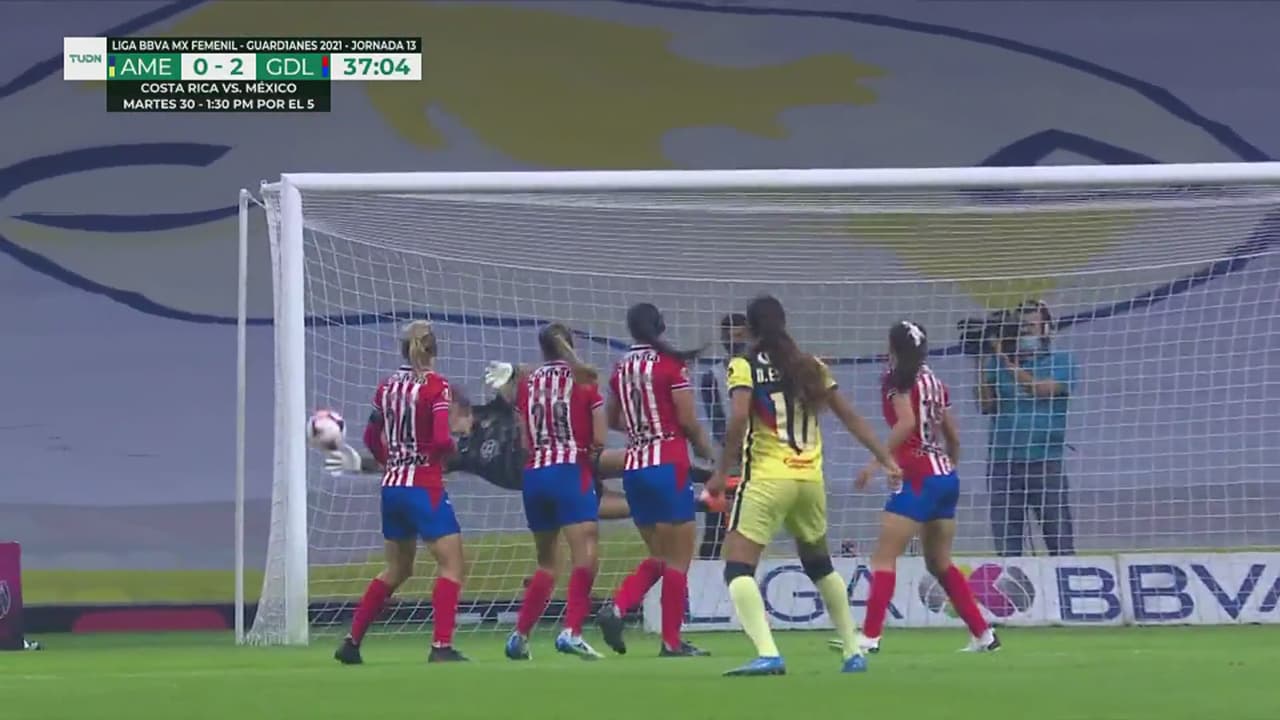 Ana Lozada estrella su intento en el larguero y después Chivas evita el tanto de Daniela Espinosa, al 37’.