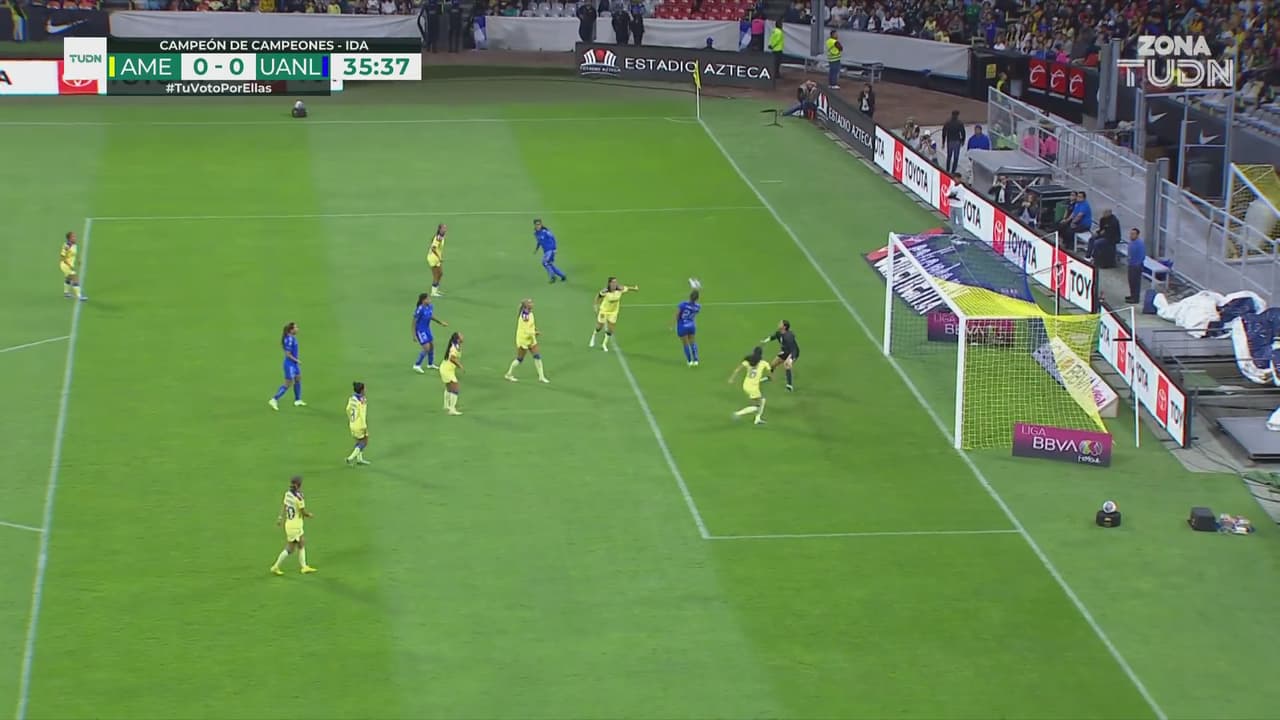 La mediocampista se queda sola frente al arco americanista, pero no logra contactar bien el balón.