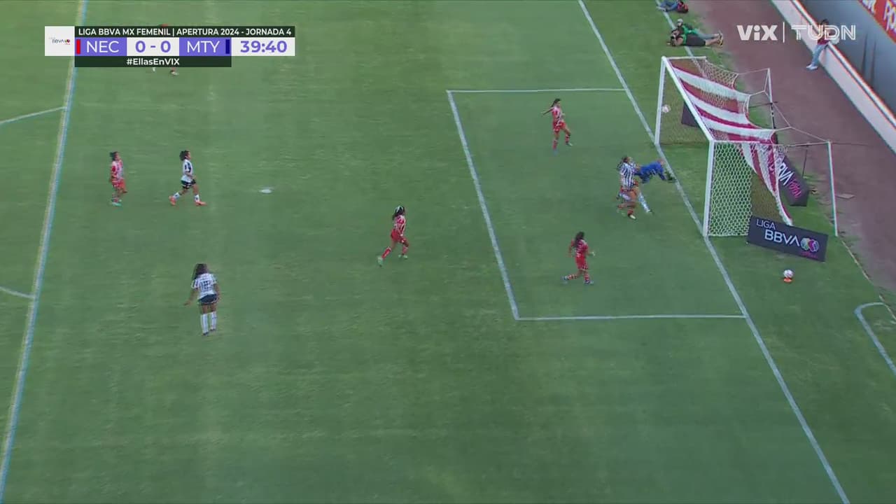 La pelota le quedó un poco arriba a Myra Delgadillo cuando Seoposenwe le baja a esférica, pero sin querer aparecer el gol.