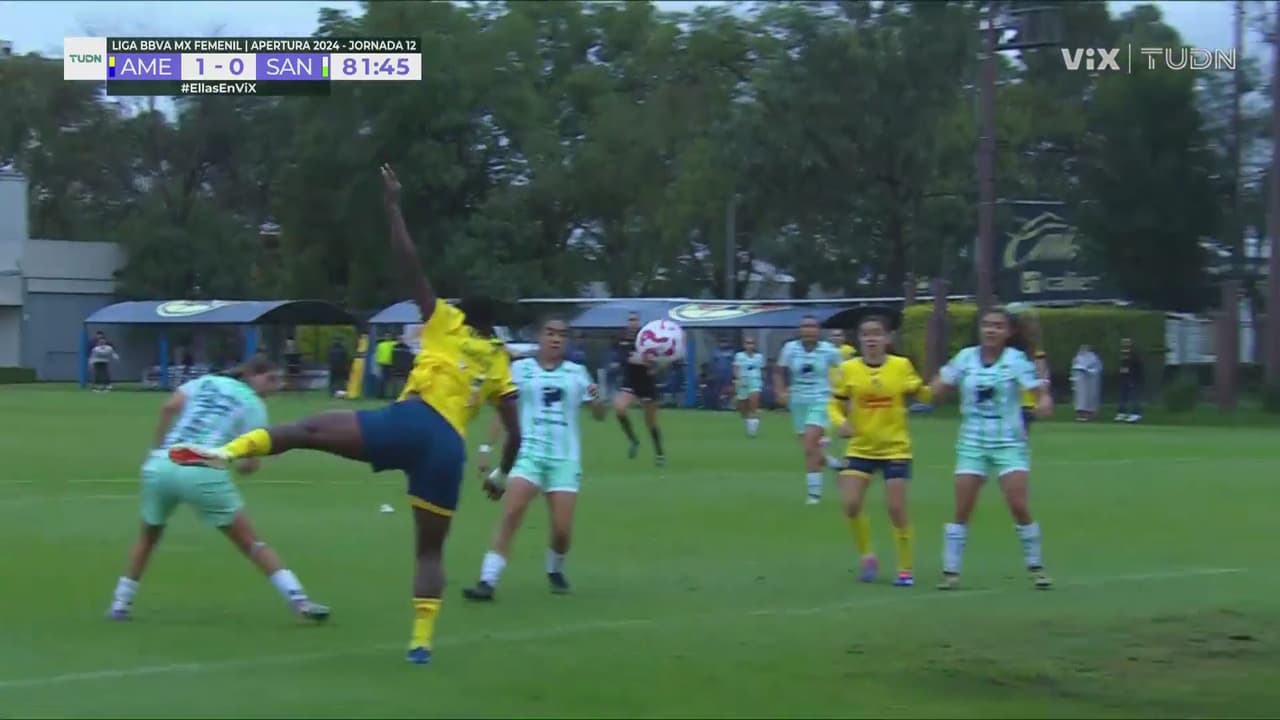 La futbolista del América ya no llega con fuerza a pegarle de cabeza al balón, por lo que se deja escapar otra oportunidad clara de gol.