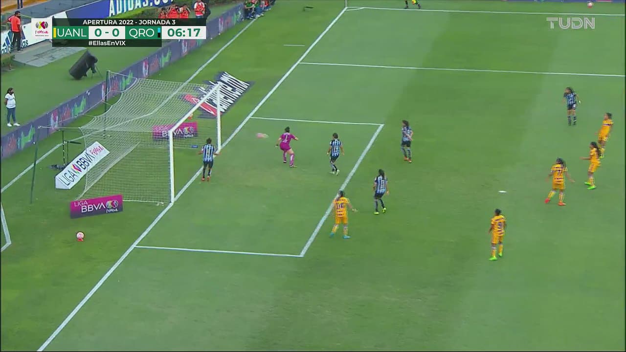 Bianca Sierra remata, desvían su tiro y pega en el poste, contrarremata y Marta ataja con su pierna al 5’.