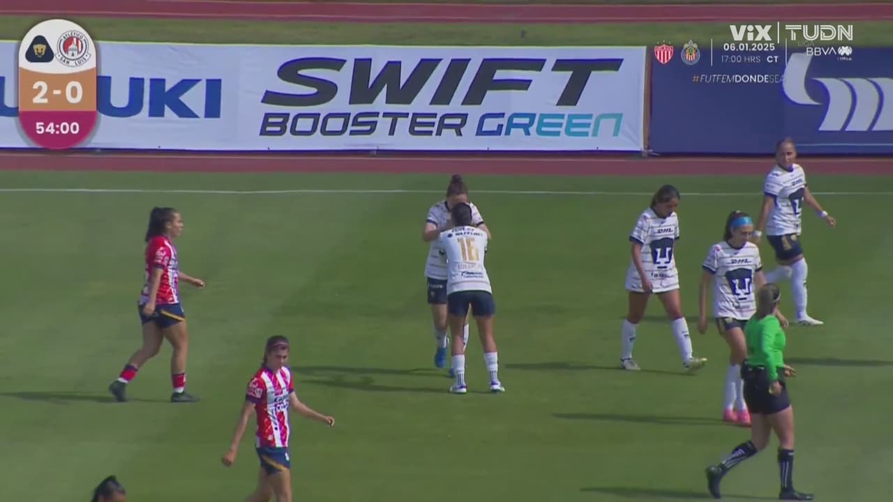 Jugada que nace en saque de banda, Alejandra Guerrero le deja servicio a Stephanie quien mete disparo, imposible para la guardameta de San Luis.