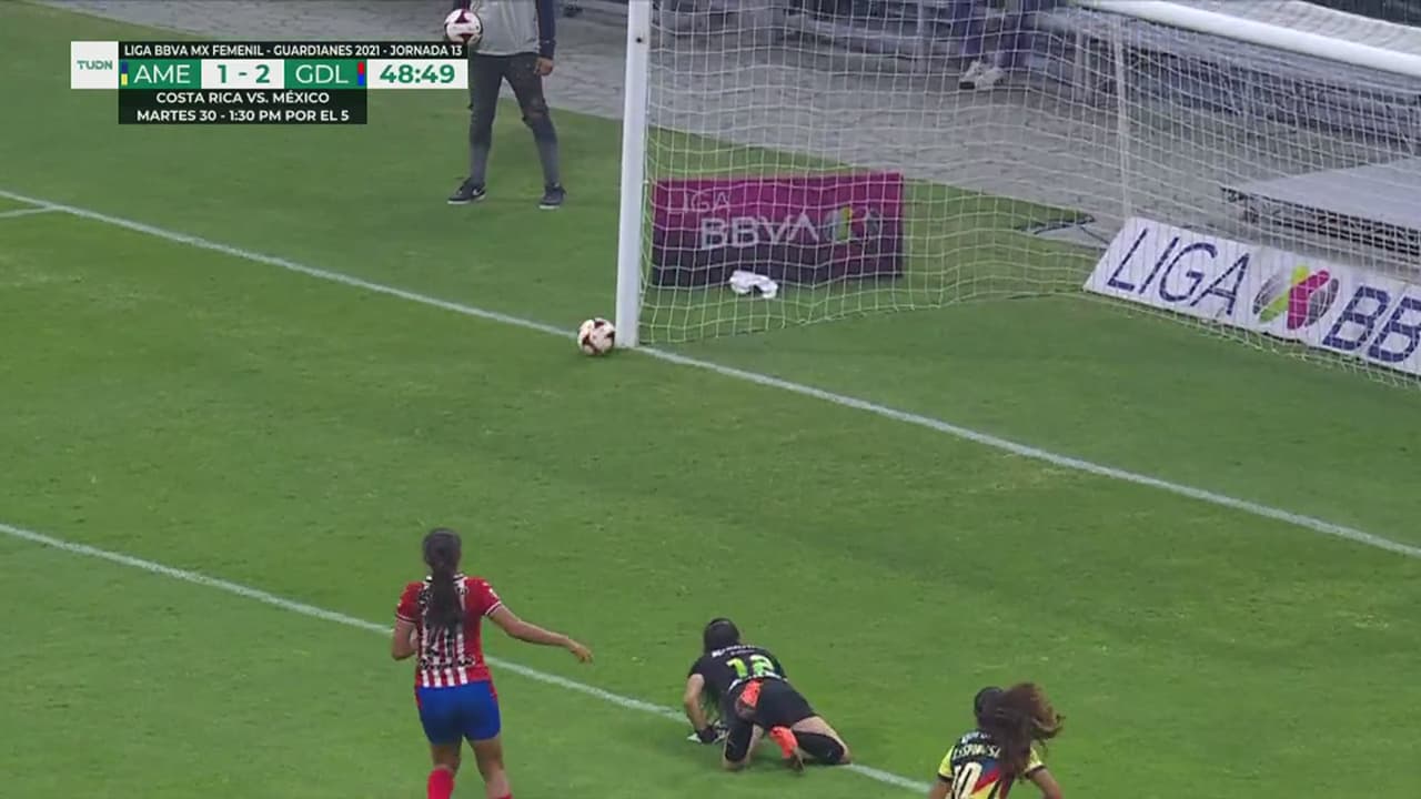 A pura velocidad, la atacante de América deja a su marca y estrella la pelota en el metal, al 49’.