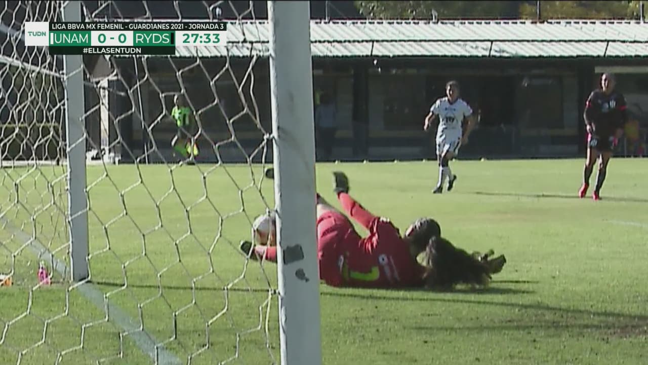 El disparo de Deneva Cagigas se le complicó a la portera de Rayadas y estuvo cerca del gol al 27’.