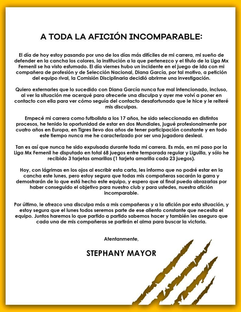 La propia Stephany Mayor escribió una carta para expresar sus disculpas a la afición de los Tigres por perderse la final en casa, además de que aseguró que no hizo tal acción a propósito.