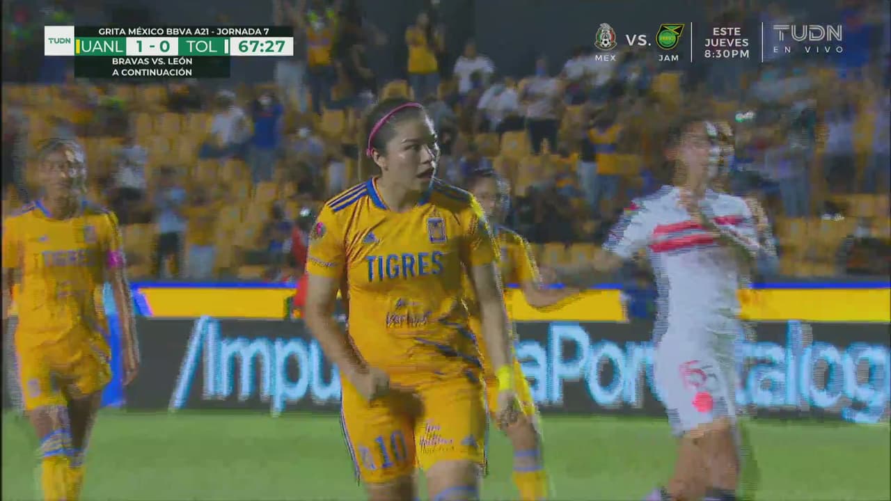 El primer gol de Tigres llegó por la vía de Katty "Killer", quien demostró su destreza frente a la portería y no perdonó a la portera toluqueña en su intento por detener el esférico.
