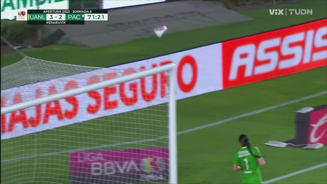 Las Amazonas habían dejado de atacar, pero en jugada de tiro indirecto Greta Espinoza remata de cabeza encima del arco de Pachuca.