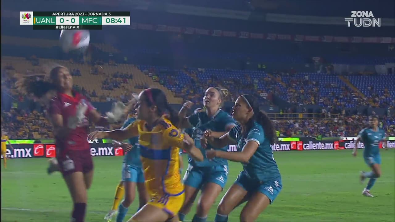 Ofensiva de las Universitarias comienza a generar peligro, Greta Espinoza no cierra la pinza y se pierde oportunidad de gol.