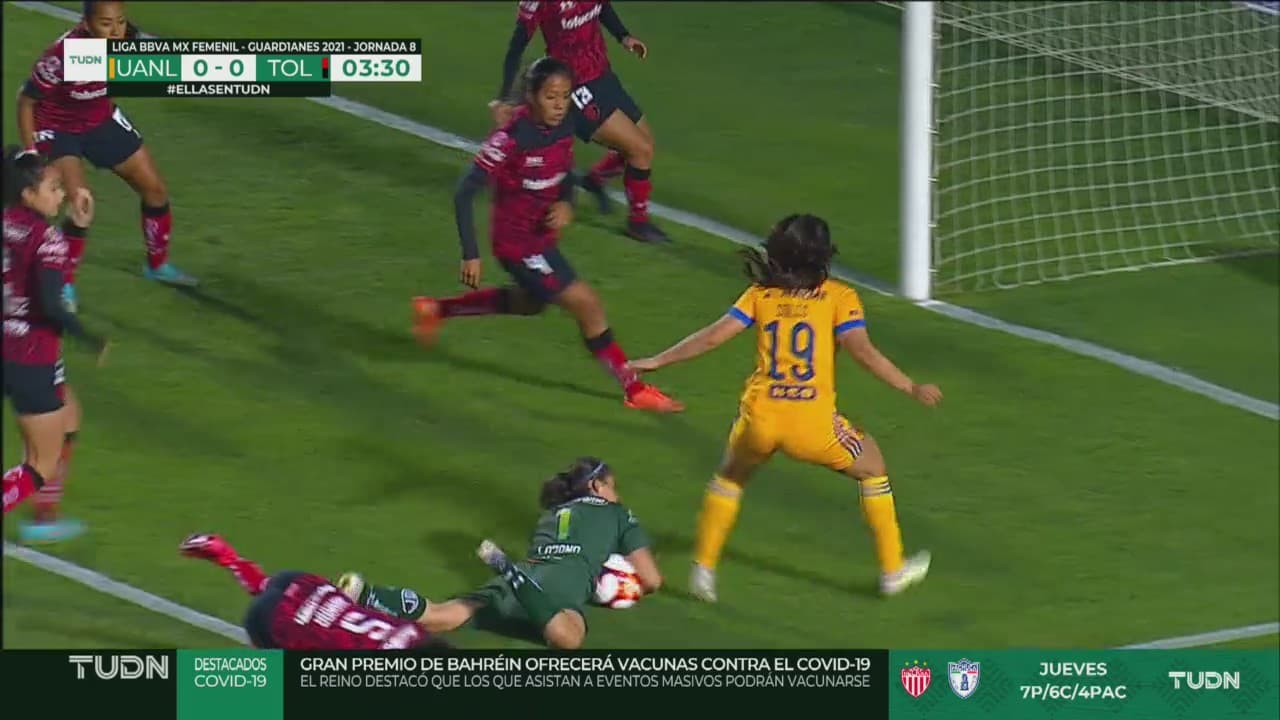 Stephany Mayor filtró para la ‘19’ de Tigres, pero la portera de las Diablas alcanzó a atajar al 3’.