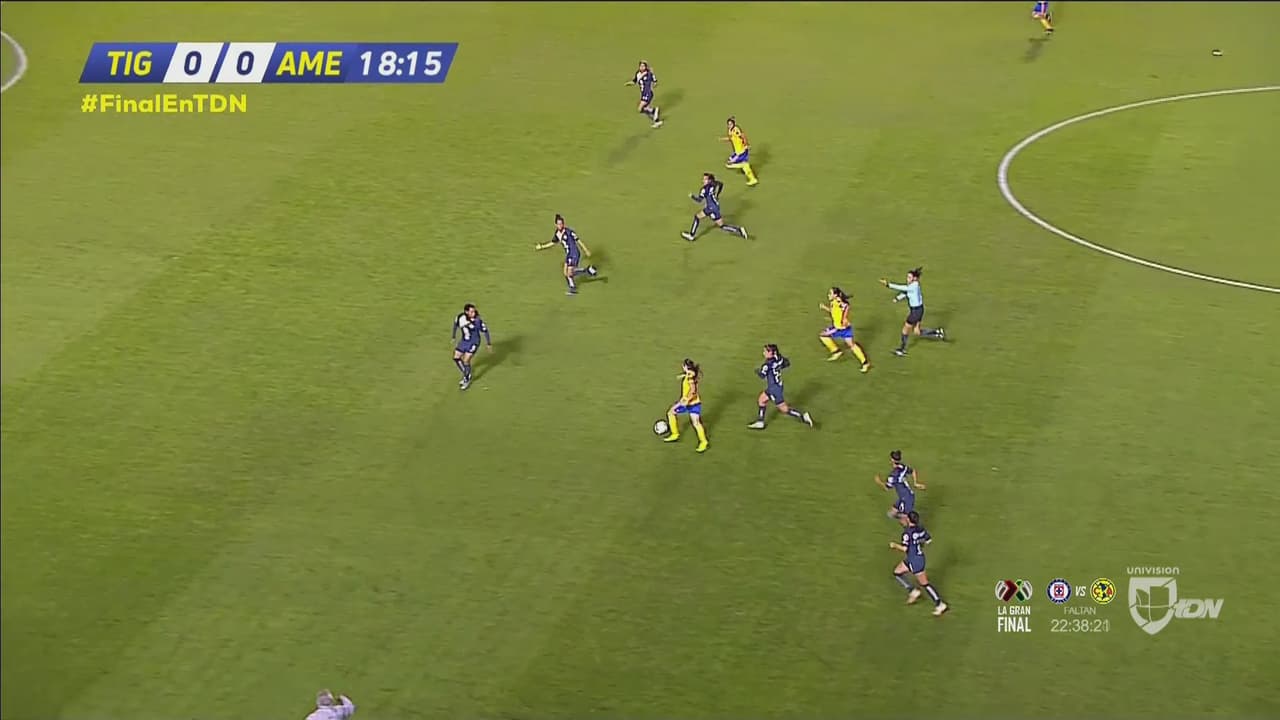 Una gran jugada en conjunto de las felinas, pone a las águilas en conflicto; sin embargo, el pase de Martínez no es aprovechado porque le queda muy largo a Cruz.