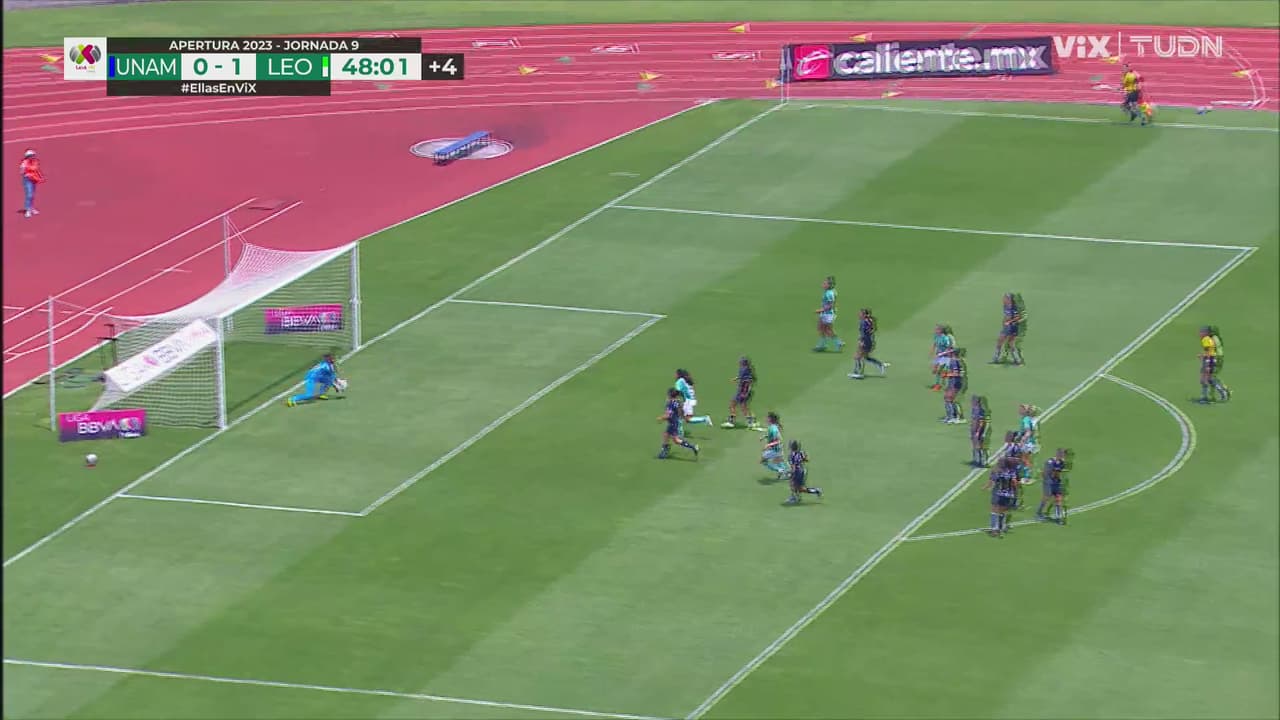 La defensora de León probó de larga distancia y la portera de las universitarias respondió.