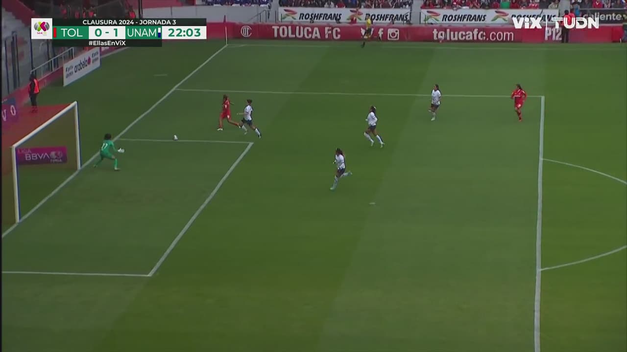La brasileña escarlata coqueteó con la igualada en un tiro cruzado que tapó con buena técnica la portera de Pumas.