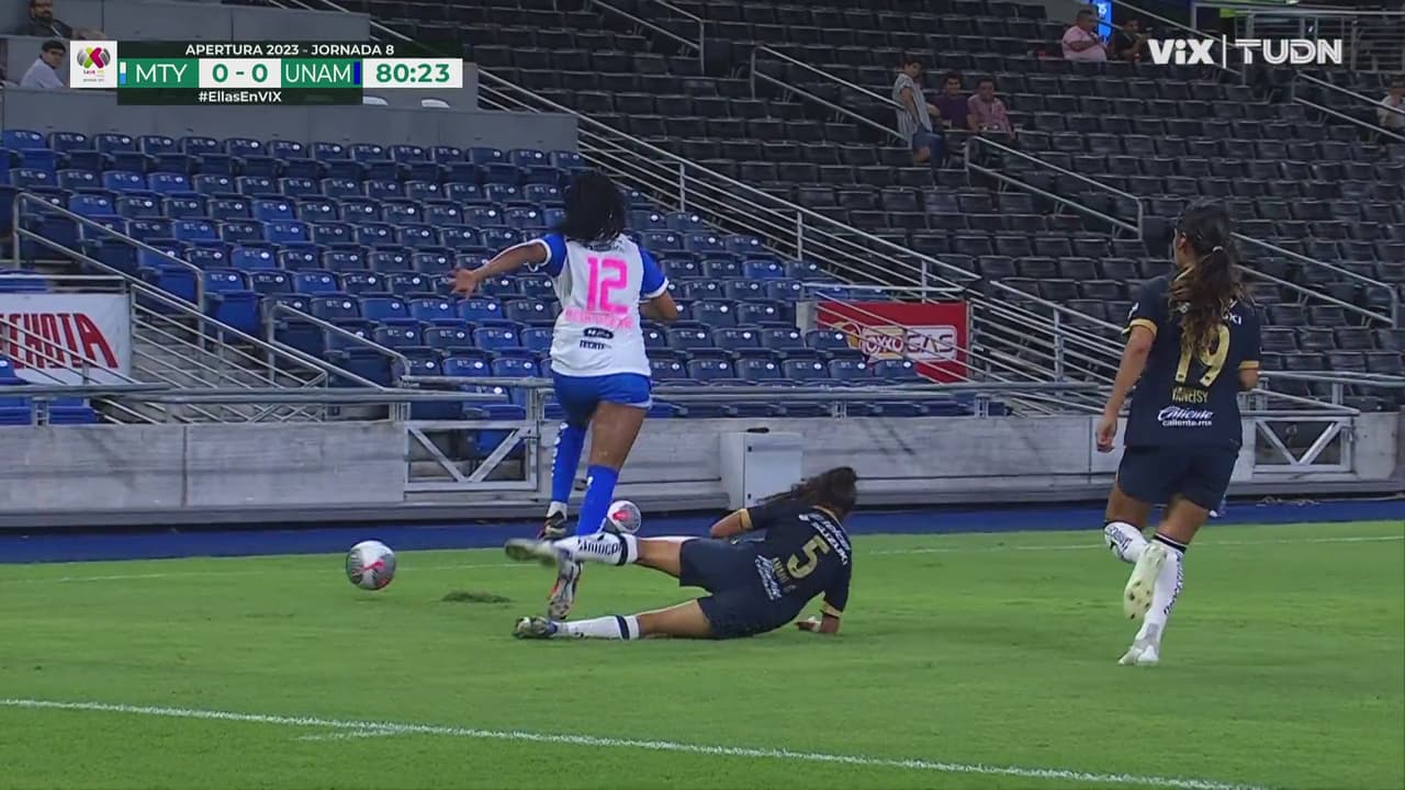En el cruce, la jugadora de Rayadas pisó a Anahí, que es atendida en el terreno de juego por el cuerpo médico.