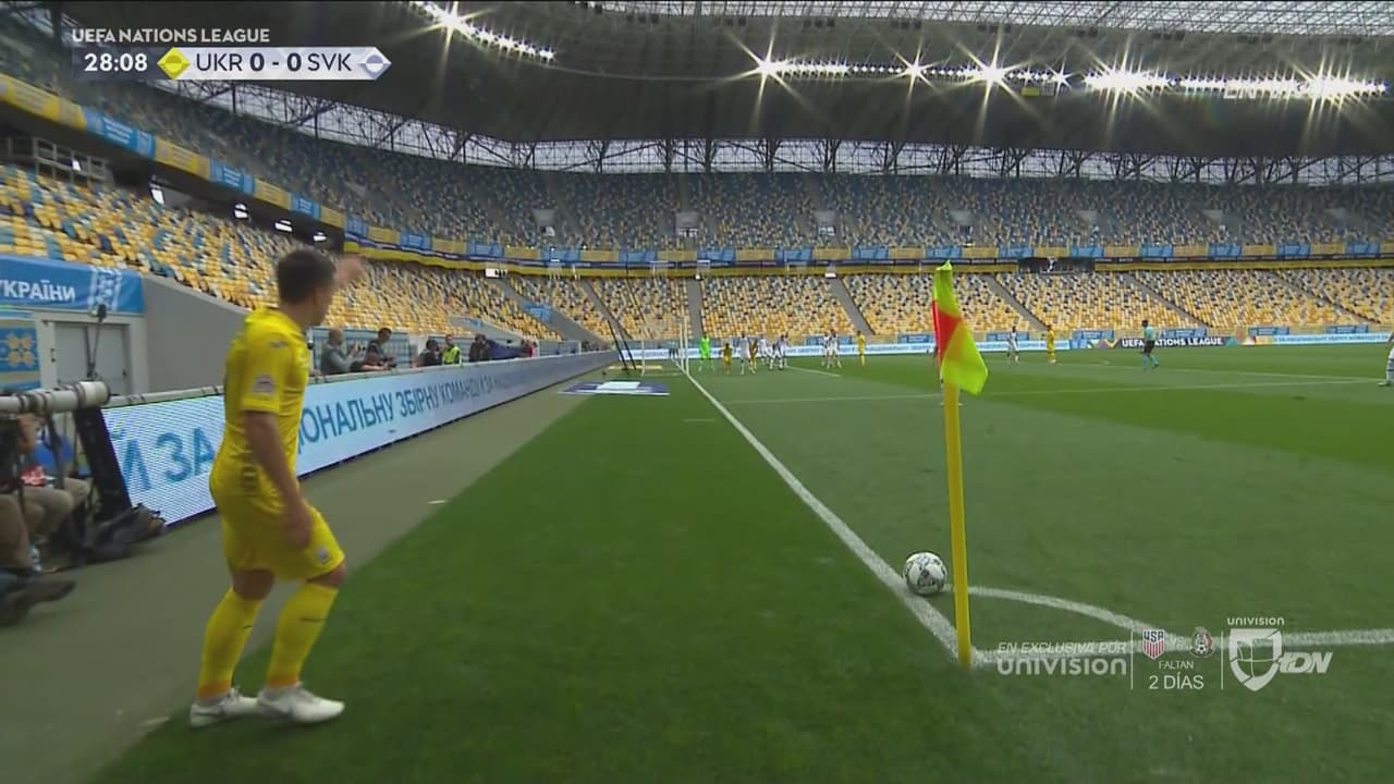 28' Ucrania toca la puerta de Martin Dúbravka con disparo de Yaroslav Rakitskiy