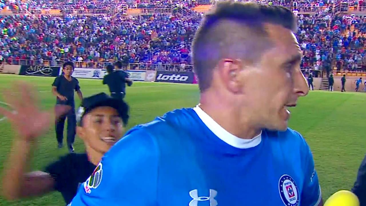 El diez de Cruz Azul se encontraba dando una entrevista al final del partido contra Alebrijes y varios aficionados entraron a la cancha para saludarlo. Pero el que lo logró se le fue un poco la mano…